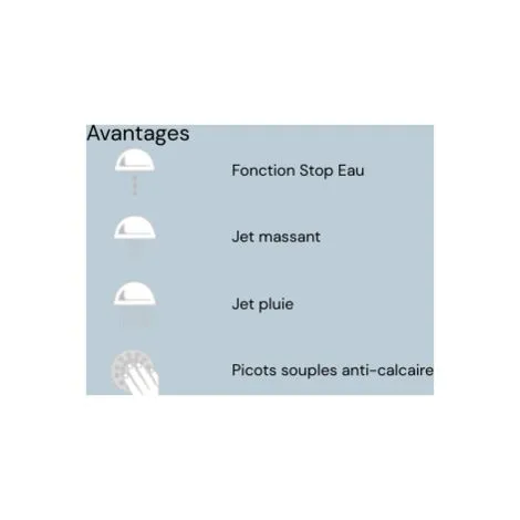 Cette douchette Go Stop 2 jets permet de choisir par simple rotation de la tête de la douchette entre un jet pluie et un jet massant. Les picots souples anti-calcaire sont une véritable aide pour l’entretien. Chromée, cette douchette a un design élancé.