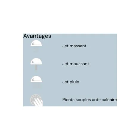 Cette pomme de douche est équipée de picots souples anti-calcaire permettant un entretien très facile, d’un simple geste de la main.
