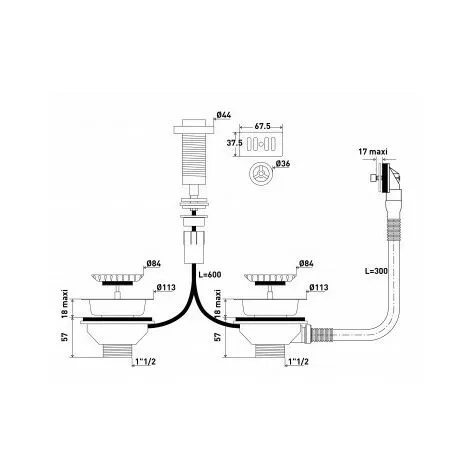 Bondes pour un évier 2 cuves percées en diamètre 90 mm, commande automatique à câble, serrage 0/18 mm. Cuvettes de 113 mm de diamètre, paniers de 84 mm de diamètre, câbles longueur 600 mm. Débit de 35 l/mn, grilles de trop plein rectangulaires et rondes fournies.